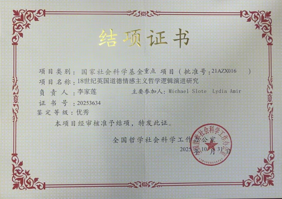 近日,全国哲学社会科学工作办公室公布了2025年10月国家社科基金年度项目结项情况。我院李家莲教授主持的2021年度国家社科基金重点项目“18世纪英国道德情感主义哲学逻辑演进研究”(项目编号:21AZX016)顺利通过结项,鉴定等级为“优秀”。