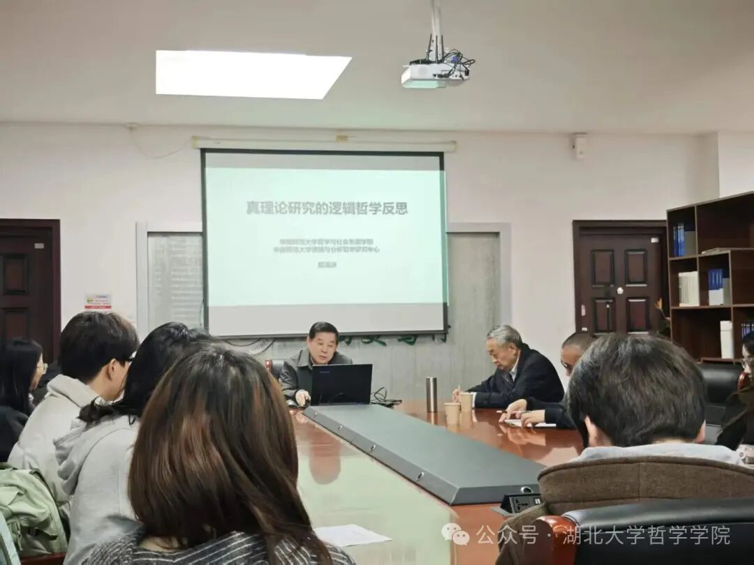讲座中,胡泽洪教授围绕“真理论”核心议题展开系统阐释。他首先从逻辑学视角厘清“真”与“真理”的概念边界,明确“真”作为谓词修饰语句或命题,将“truth”译为“真”可与马克思主义哲学中的“真理”体系相区分,并界定真理论是涵盖“真”之载体、含义、检验等问题的多维度研究总称。